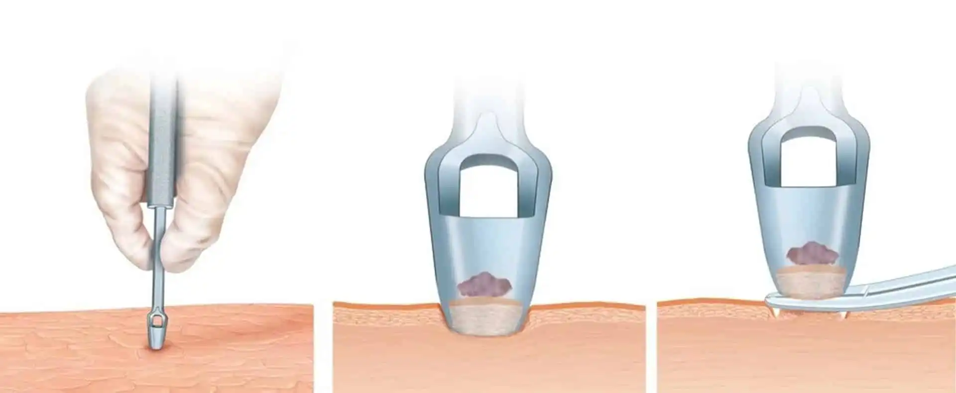 După anestezie locală, se folosește un instrument rotund pentru a extrage un mic cilindru de piele.